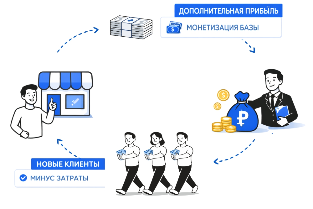 А партнер получает дополнительную прибыль за счет монетизации своей базы клиентов или своих контактов.