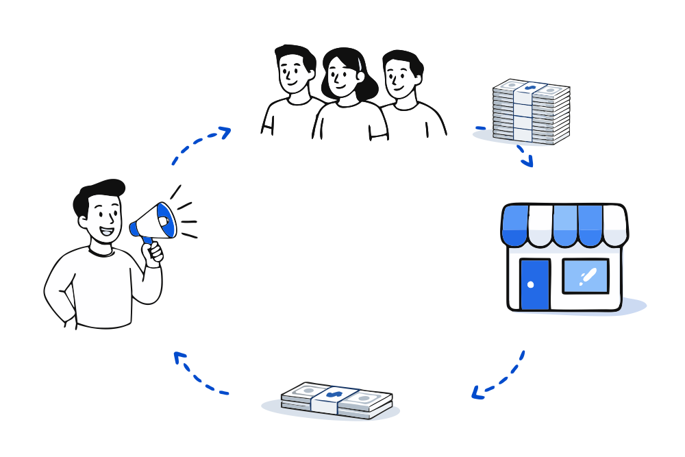 Партнеры будут приводить клиентов из своей клиентской базы смежного бизнеса или базы контактов и получать оплату за результат (целевые действия).
